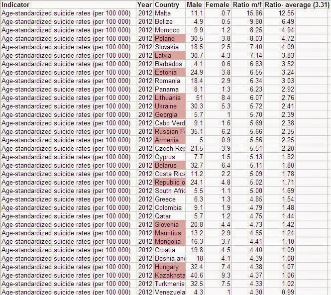 Харин эр, эмийн амиа хорлолтын харьцаагаар Монгол улс дэлхийд дээгүүр орсон байна. Дэлхийн дунджаар эмэгтэйчүүдээс 3,3 дахин олон эрэгтэй хүн амиа хоролдог байна. Гэтэл дээр жагсаасан улсуудад эрэгтэй хүмүүсийн амиа хорлох тоо нь дундажаас их байдаг байна. Нөгөө л хуучин социалист орнууд, Монгол тэргүүлэх байр эзлэж.